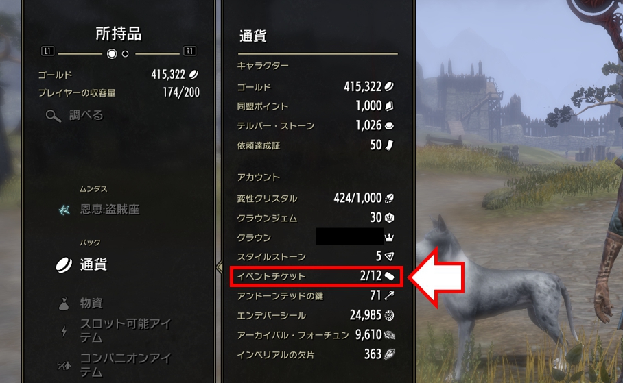 イベントチケットの所持数は、メニュー > 所持品 > 通貨 から確認する事ができます。