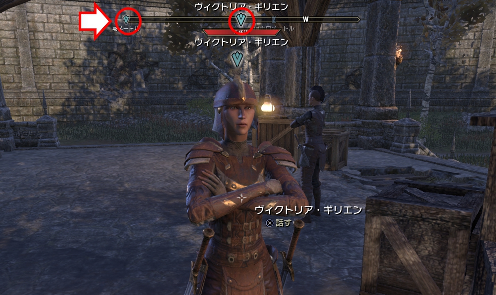 シロディールに入った後、近くにいるクエストマーカーのある人物に話しかけ、「シロディールへようこそ」のクエストを受注します。