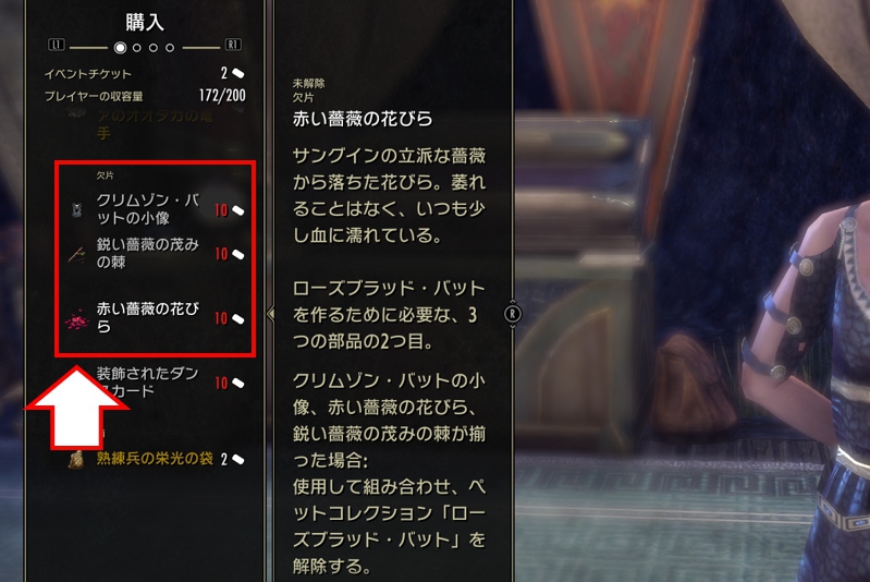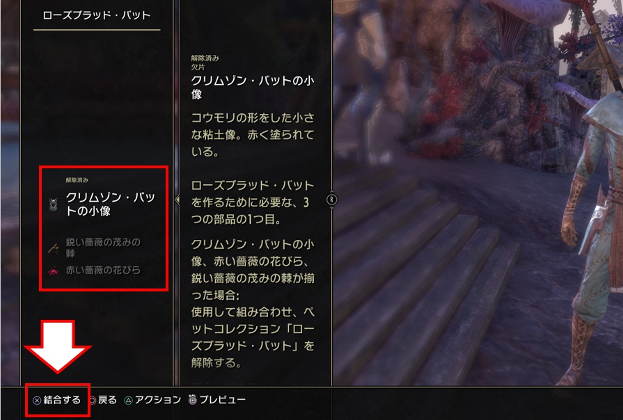 この3つを集めた後、『メニュー > コレクション > コレクション > 断片』より、『結合』を行うと、特別なペット『ローズブラッド・バット』と交換する事ができます。