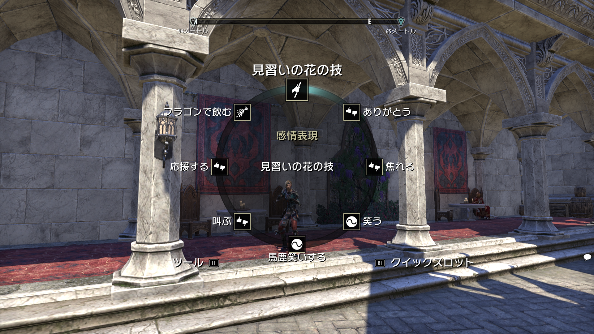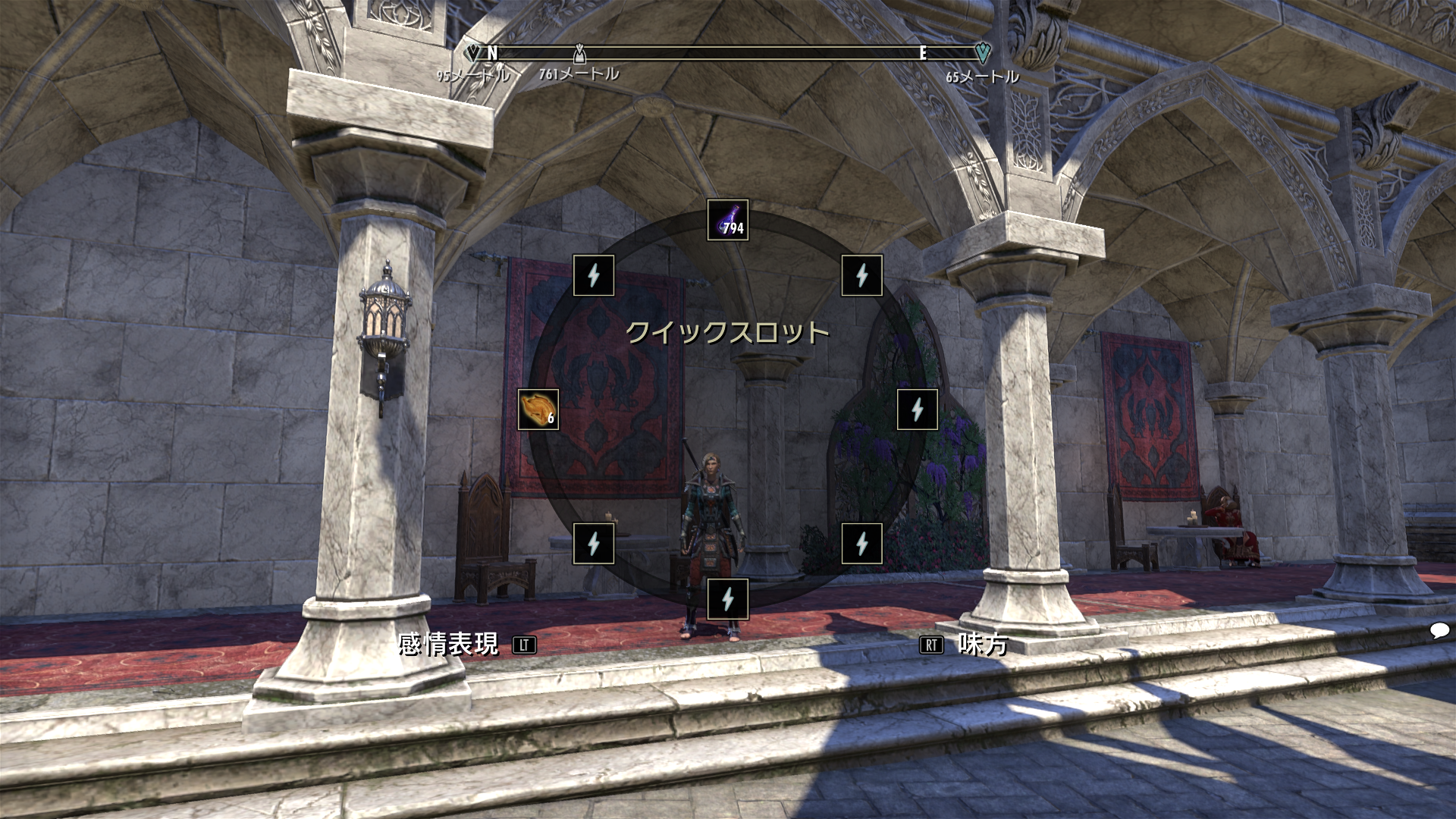 3)『クイックスロット』で使用する場合は『クイックスロット』で使用したい感情表現の方向へ右スティックを入力後方向キー上を離し、その後方向キー上を短く押すと使用できます。