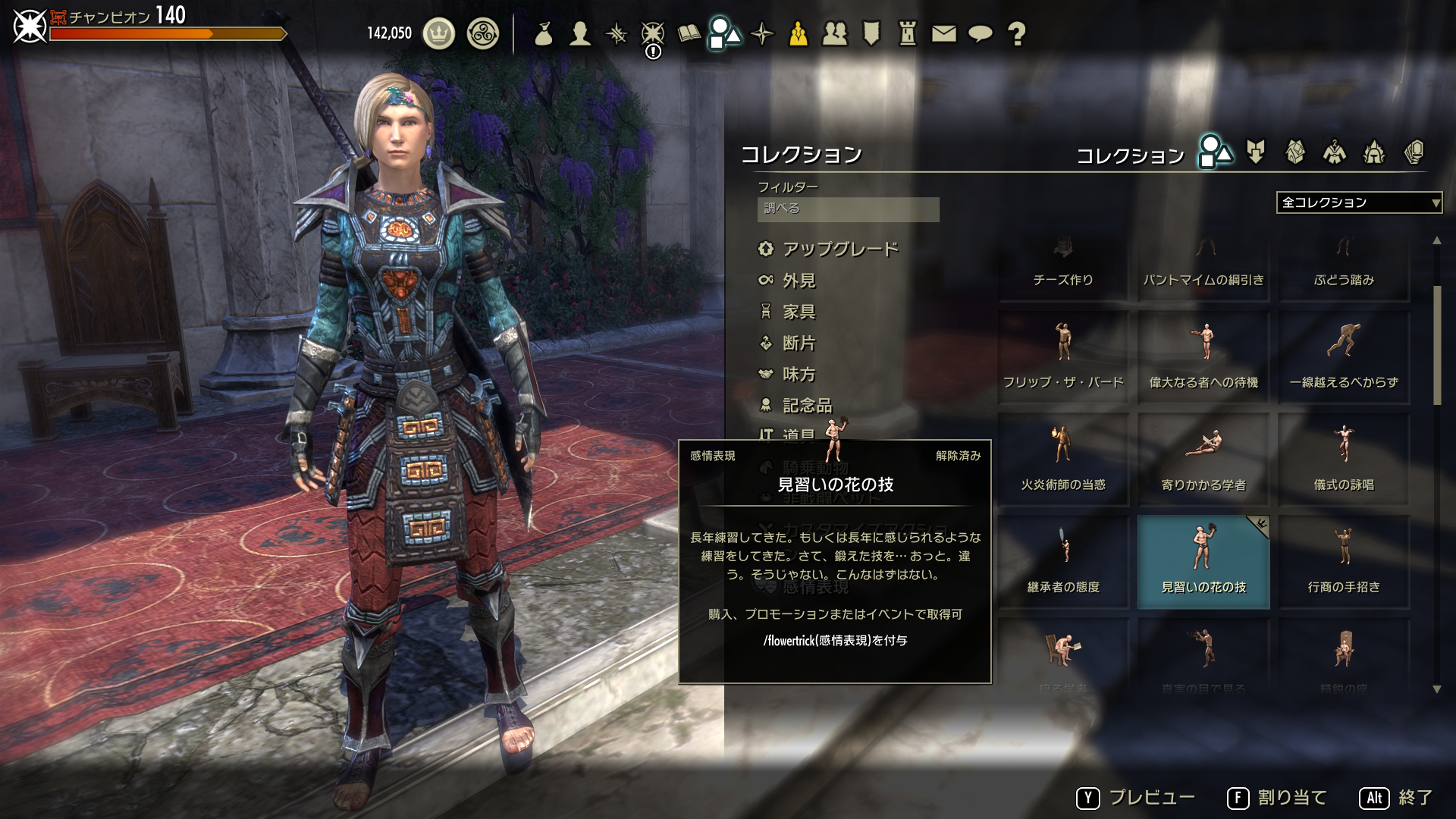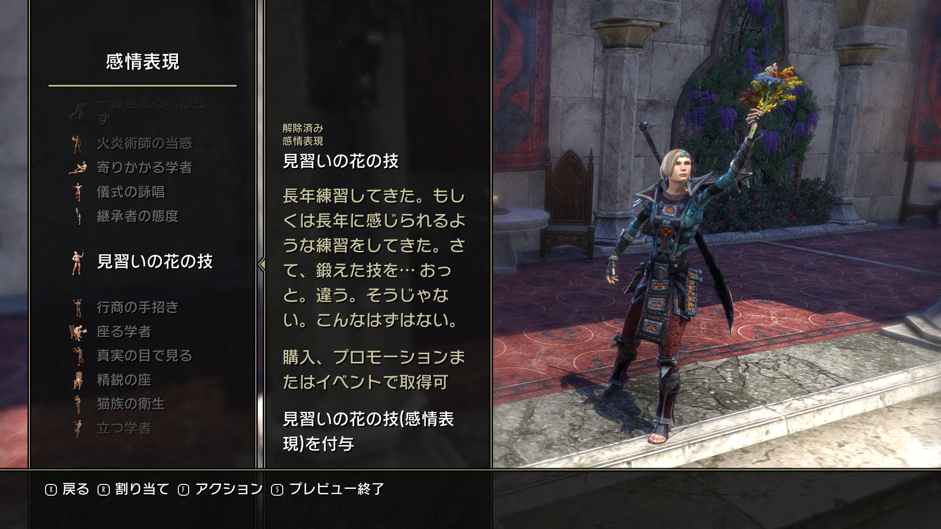 「見習いの花の技」は、ゲーム中に使用できる感情表現(エモート)となります。