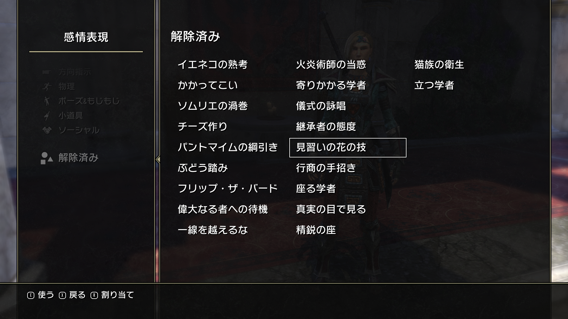 2)「解除済み」内の『見習いの花の技』にカーソルを合わせてXボタンを押し、感情表現スロットの設定画面へ移行します