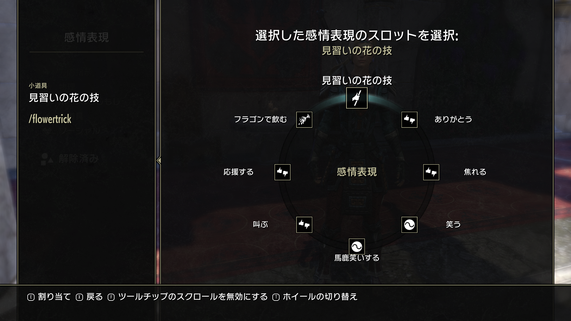 3)感情表現の娯楽カテゴリが開くので、『/flowertrick』を探して『/flowertrick』上で左クリック、左側の感情表現ホイール上の設定したい箇所へドラッグ&ドロップします