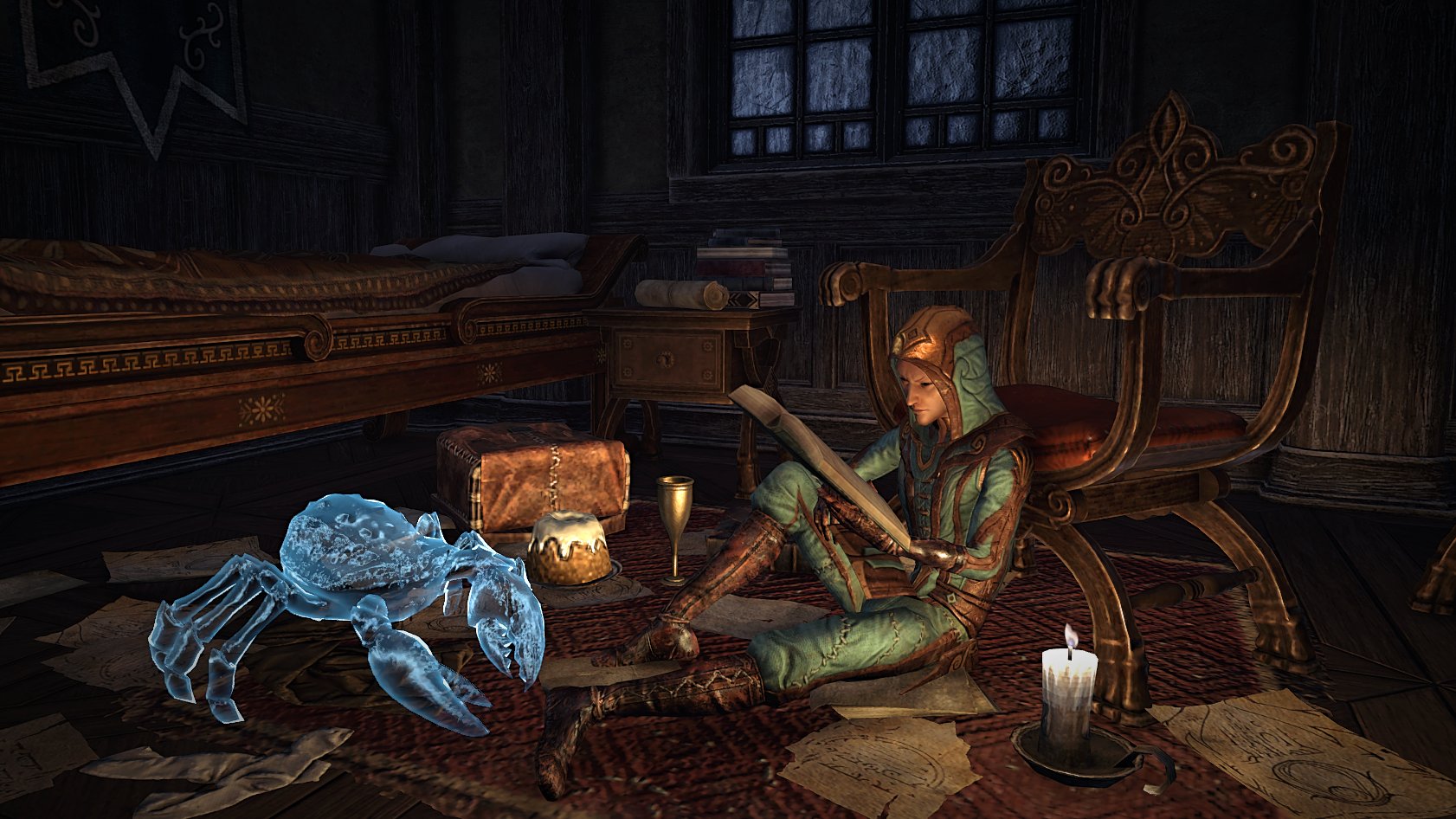 「もしレヤウィンの魔術師ギルドに宿泊する予定なら、スイートロールを買うのを忘れるな。あそこは邪悪なマッドクラブの幽霊が出るからな。──おいおい、笑い事じゃないぞ。アイツは甘いものを捧げないと寝てる間に書きかけの論文を切り刻むんだからな!」