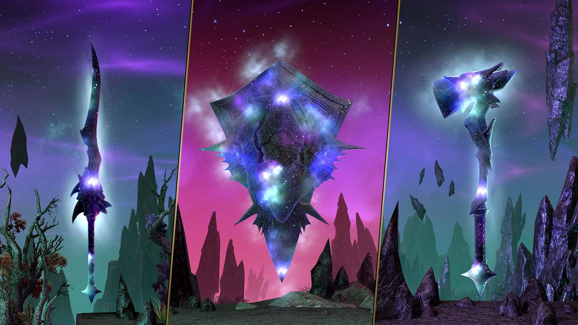 セレスティアルへの崇拝を、星の力を反映した武器を装備して示そう! このスタイルの完全なセットを使って、武器の外見をエセリウスの拘束衣装スタイルに合致するよう変更する。