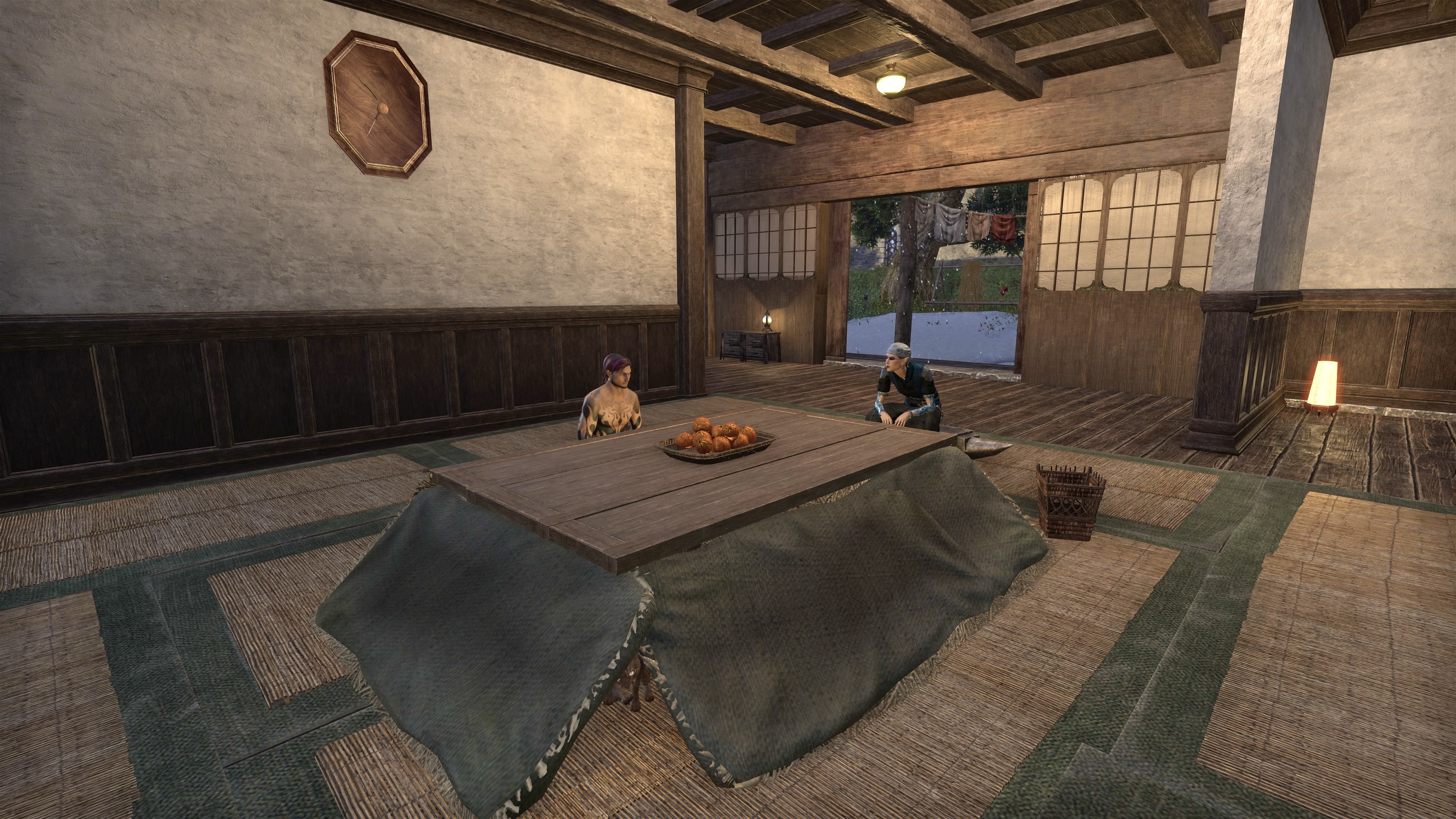 コメント:冬といえば、コタツでみかん。 しんしんと降る雪を眺めながら、温かな部屋でのんびり過ごす。 メリーヴァインの敷地に、そんな懐かしい「おばあちゃんち」を再現してみました。 タムリエルで味わう、穏やかな「こたつ日和」の一幕です。