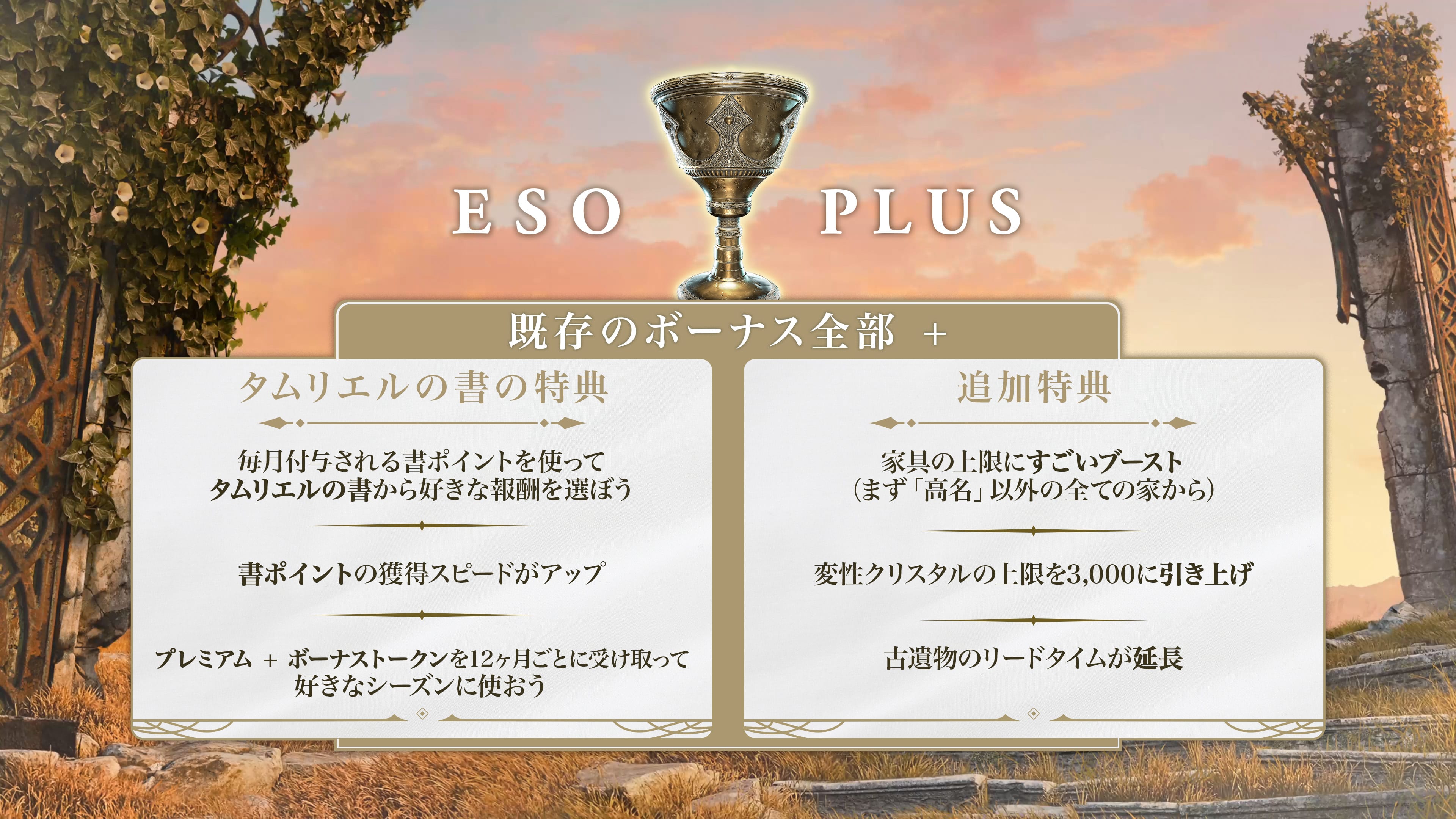 ESO Plusメンバーシップを持っている場合、各シーズンの書からいくつかの恩恵を得られます。これには次のものが含まれます: