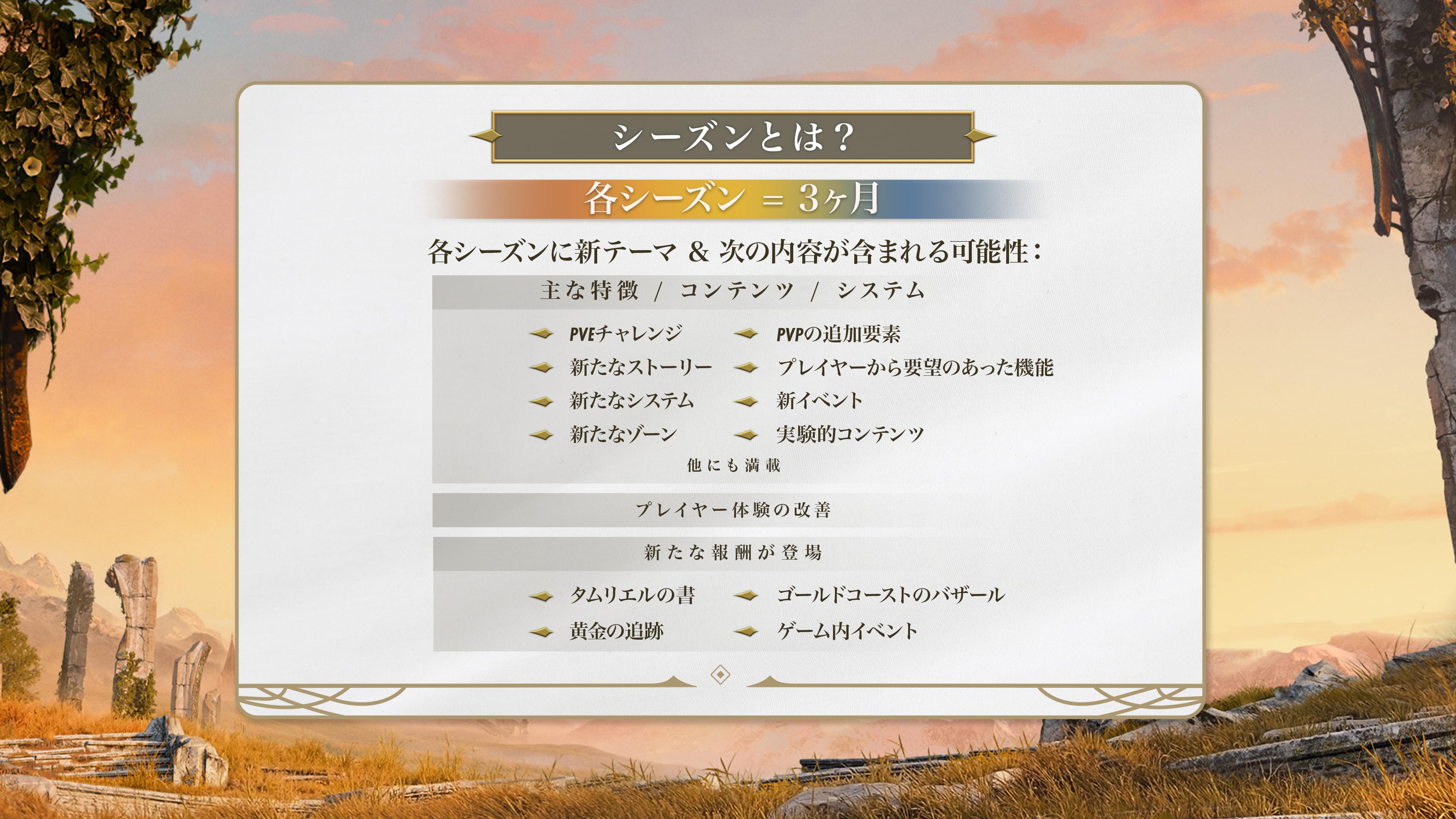 『ESO』におけるシーズンとは、刺激的な経験とアップデートの詰まった箱のようなものです。それぞれのシーズンには新たな冒険、探検すべき領域、新しい遊び方など、皆さんが『ESO』に期待するコンテンツが3ヶ月の期間に限定されて登場します。それぞれのシーズンは特別なテーマとゲームプレイ上の追加要素を含み、同じシーズンはありません。これまでに体験したものとは大きく異なる内容も出てくるでしょう! 開発チームは一年分の大型アップデートに取り組む必要がなくなり、新たなコンテンツが一年を通して(またそれぞれのシーズンを通して)登場し、プレイヤーの選択肢をより多彩にします。