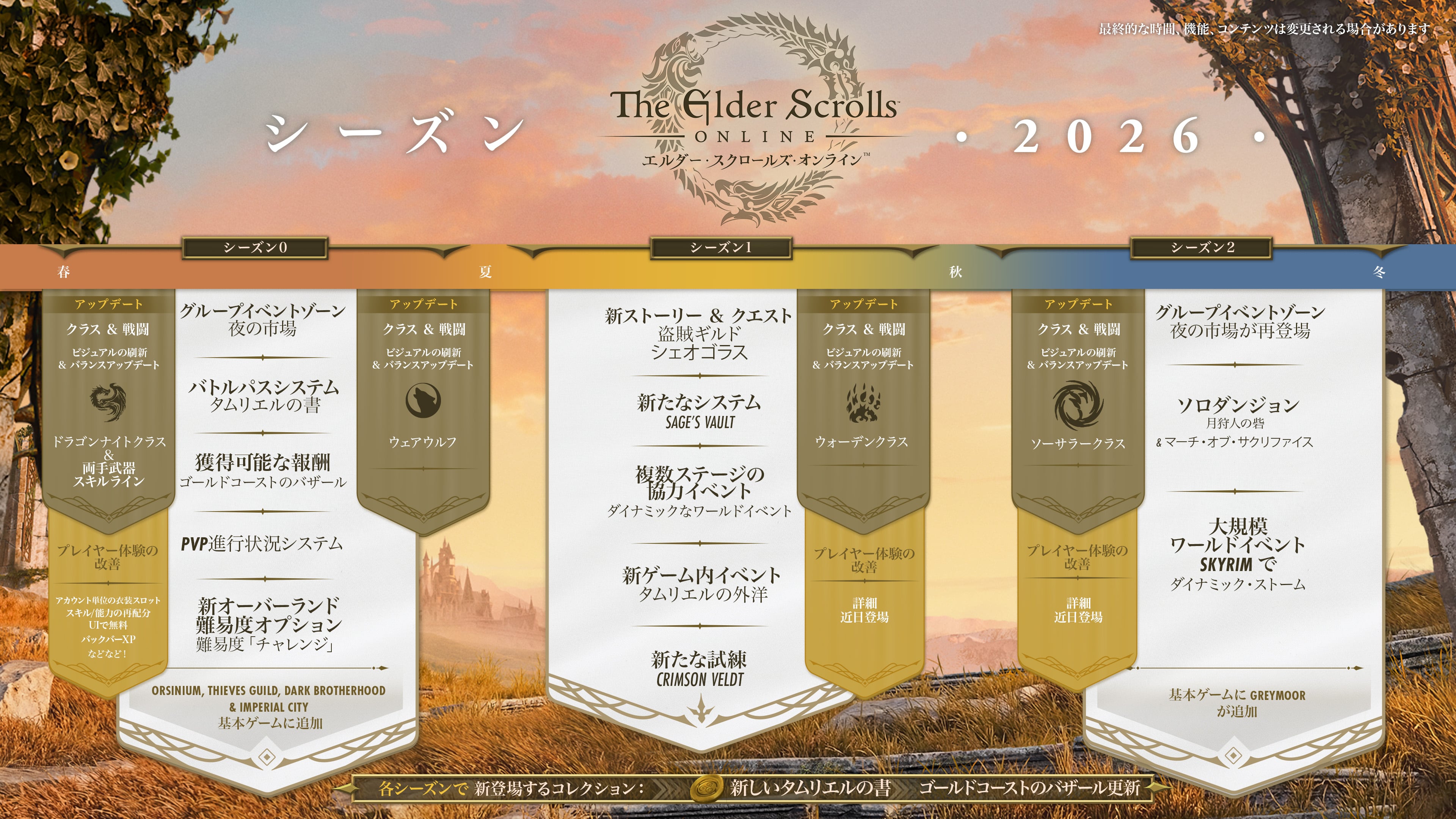 重要な点として、シーズンに含まれる新しいゲームプレイコンテンツは、新たなゾーンやダンジョン、ストーリー、システム、クラス、スキルラインなどを含めたすべてが、ベースゲームの全プレイヤーに無料で開放されます。新コンテンツへの壁を取り除くことを望んでいるのです。すべての『ESO』プレイヤーがタムリエルの新要素を無料で、同時に楽しめます。