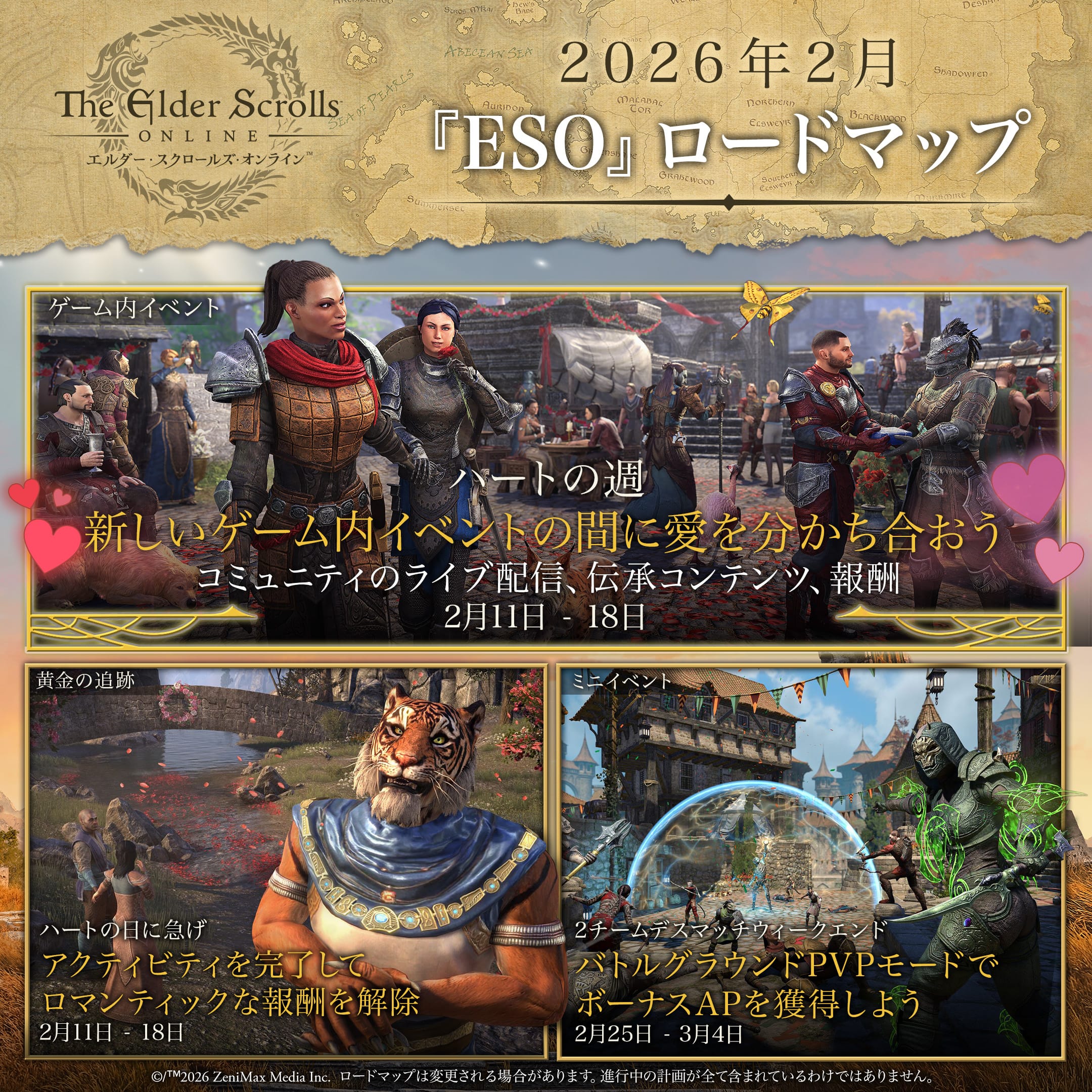 特別な相手と冒険するのでも、コンパニオンのレベルアップに忙しいにしても、この2月の『ESO』は愛に満ち溢れています。今月はウェブサイトやソーシャルチャンネルであらゆる種類の「ハートの週」のコンテンツに注目しておきましょう(ロアマスターの保管庫を含む)。Xでこの初めてのイベントでの計画をお知らせください!