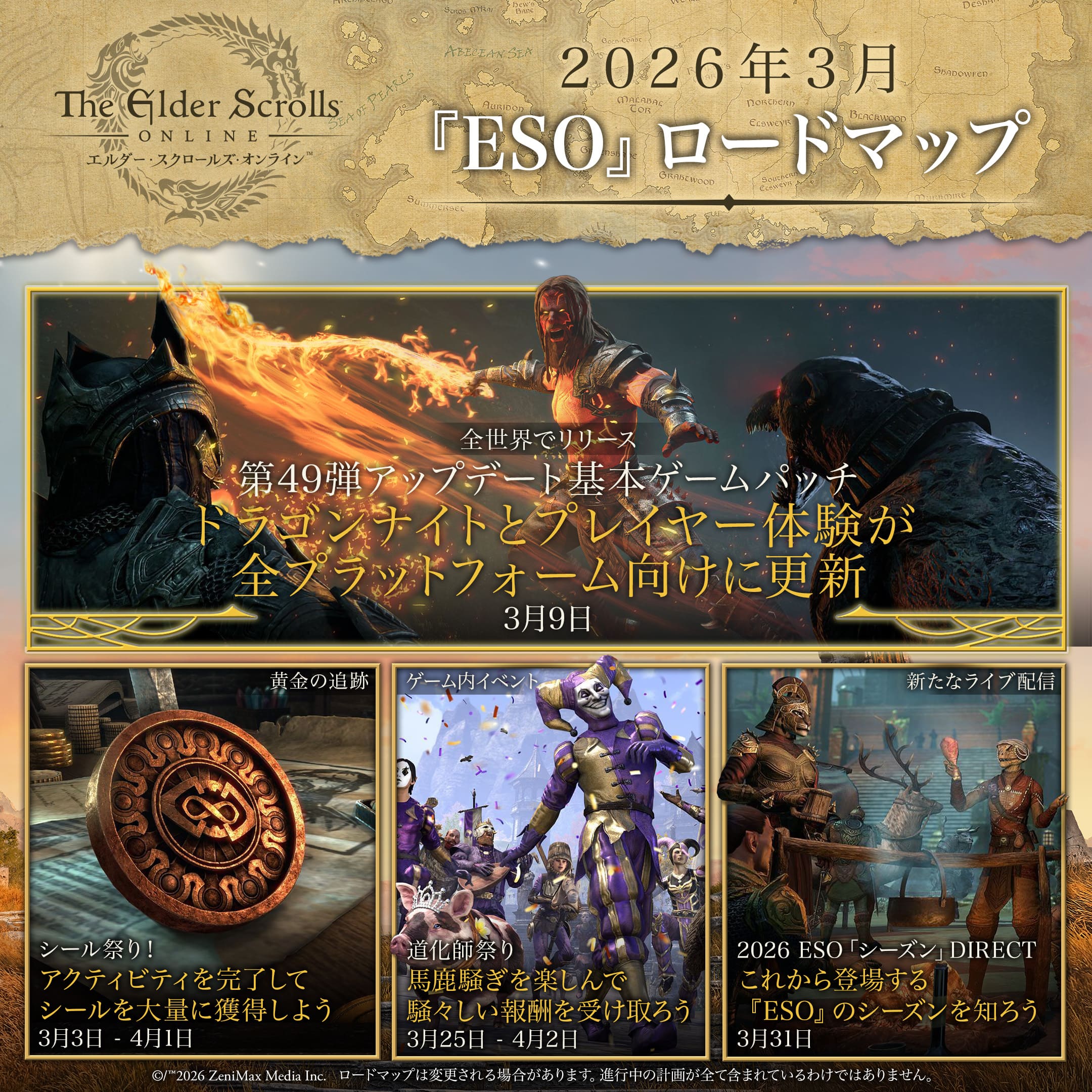 無数のイベントやキャンペーンとともに第49弾アップデートのローンチを目前に控え、この3月の『ESO』には楽しみが盛りだくさんです! 見逃せない配信の予定を含む、さらなる内容の公開も予定しています。公式サイトに何度もアクセスして、今後のニュースやアップデートをご確認ください。皆さんはどのイベントが一番楽しみですか?SNSでお知らせください!
