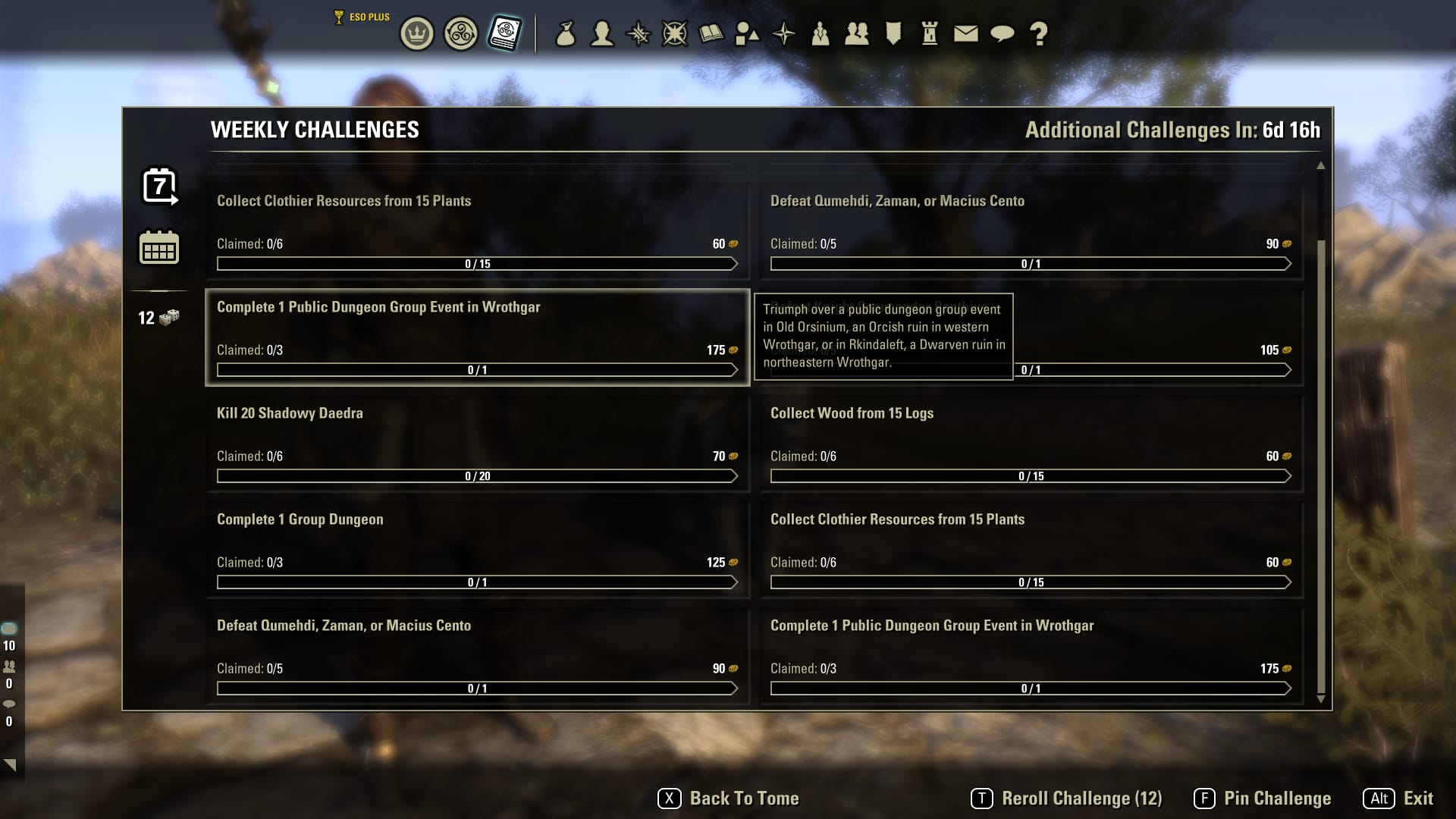 メインメニューから現在のタムリエルの書を見ることができます(アイコンの位置はクラウン木枠箱の隣です)。そこから書のページとチャレンジ、現在保有中の書ポイント、進行度を確認できます。