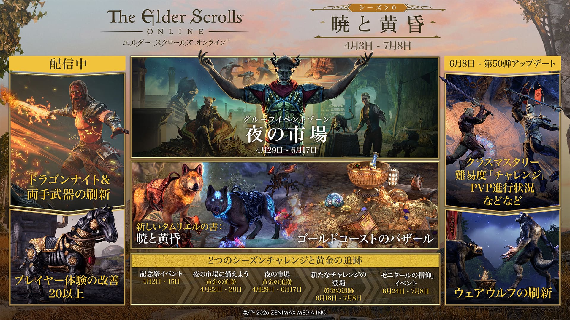 シーズン0: 暁と黄昏が現在すべてのプラットフォーム(PC/Mac、Xbox、PlayStationを含む)で配信され、『エルダー・スクロールズ・オンライン』の新時代が幕を開けます。この最初のシーズンは4月2日から7月8日までで、新たな報酬システム、プレイヤーを重視した改善の第1弾、クラスと戦闘の再設計、新たなゾーンとチャレンジなどを導入し、今後の全シーズンの基盤となるものです。